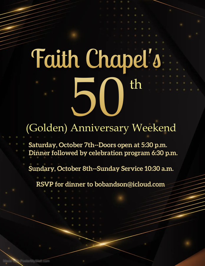 FREE! We are celebrating 50 YEARS of Faith Chapel spreading the gospel in Stanley / Overland Park! We will serve dinner and share stories of God’s faithfulness for five decades and counting. Help us celebrate all that God has done and is doing in Overland Park and now at our other 3 campuses – Louisburg, Gardner, and Pleasanton.