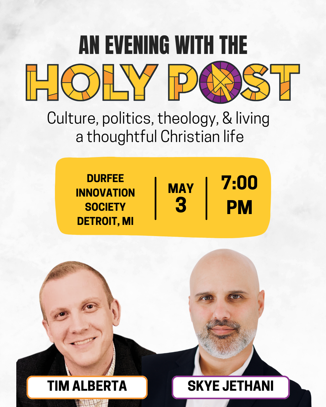 YOU’RE INVITED to experience the Holy Post in person on May 3rd in Detroit, MI! Join Holy Post host Skye Jethani and special guest Tim Alberta for a conversation on faithfully navigating this current moment, an audience Q & A, and time to connect with the Holy Post community!