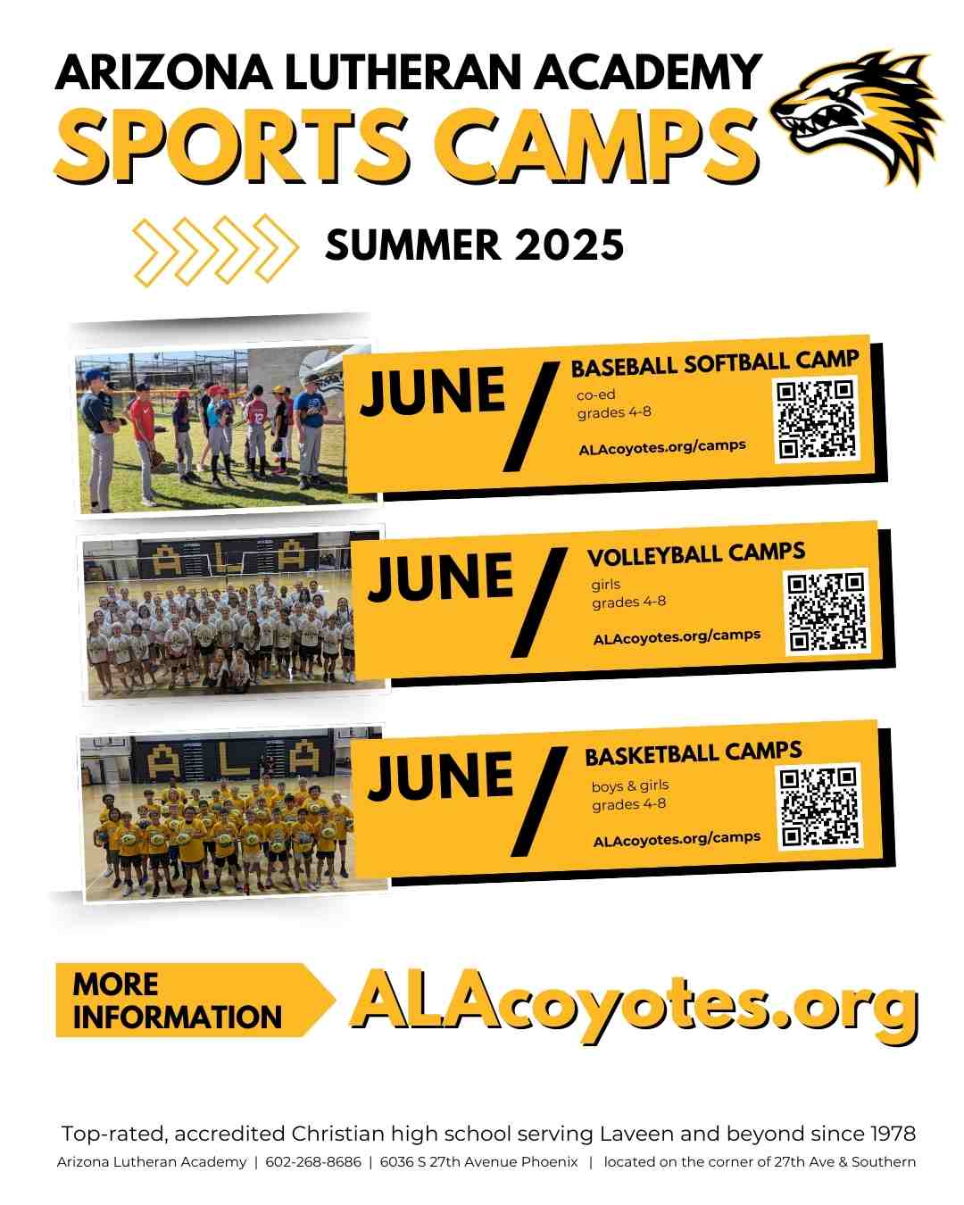 Coyote Summer Sports Camps at Arizona Lutheran Academy offer top-notch, affordable instruction in baseball, softball, volleyball, and basketball! Kids will learn the fundamentals, sharpen their skills, and have a blast practicing—all under the guidance of ALA’s experienced teachers and coaches.
