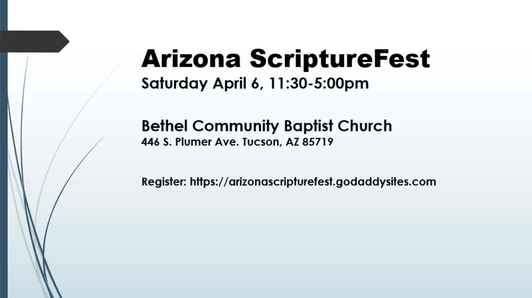 Event description: Bethel Community Baptist Church invites individuals, groups, and families, to join them for a dynamic scripture memorization recital event. This year’s theme is the resurrection of Jesus. ScriptureFest will take place on Saturday April 6 from 11:30-5:00 at Bethel Community Baptist Church located at 446 S. Plumer Ave, Tucson, AZ 85719. This is a completely free event.