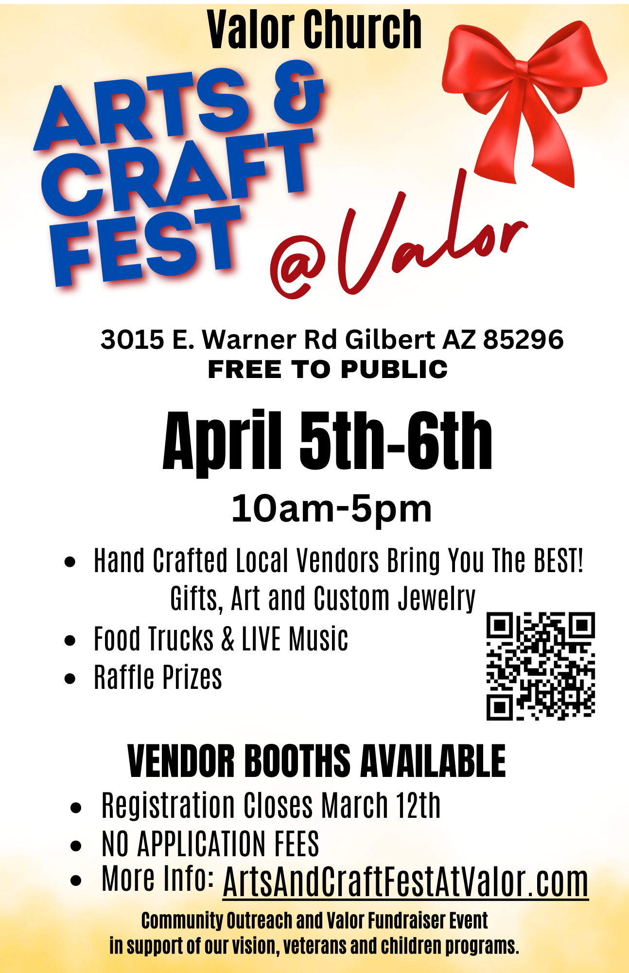 This is our inagural semi-annual Arts and Craft Fest bringing community together to celebrate life and fellowship while supporting veterans. 100 vendors, arts, crafts, live music, kid zones (crafts, games, etc), food trucks, raffles and more.