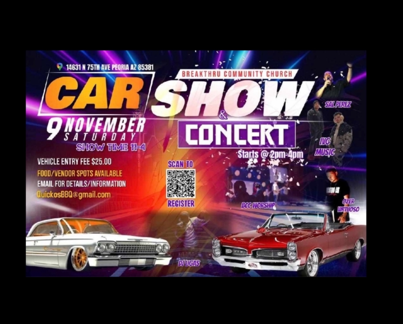 Car Show & Concert presented by BreakThru Community Church! This is a Family-friendly event open to the public with live performances by Pastor Sal Perez, IVG Music, Ozer Virtuoso and BCC worship. Come out & enjoy a day of fun fellowship, entertainment & food!