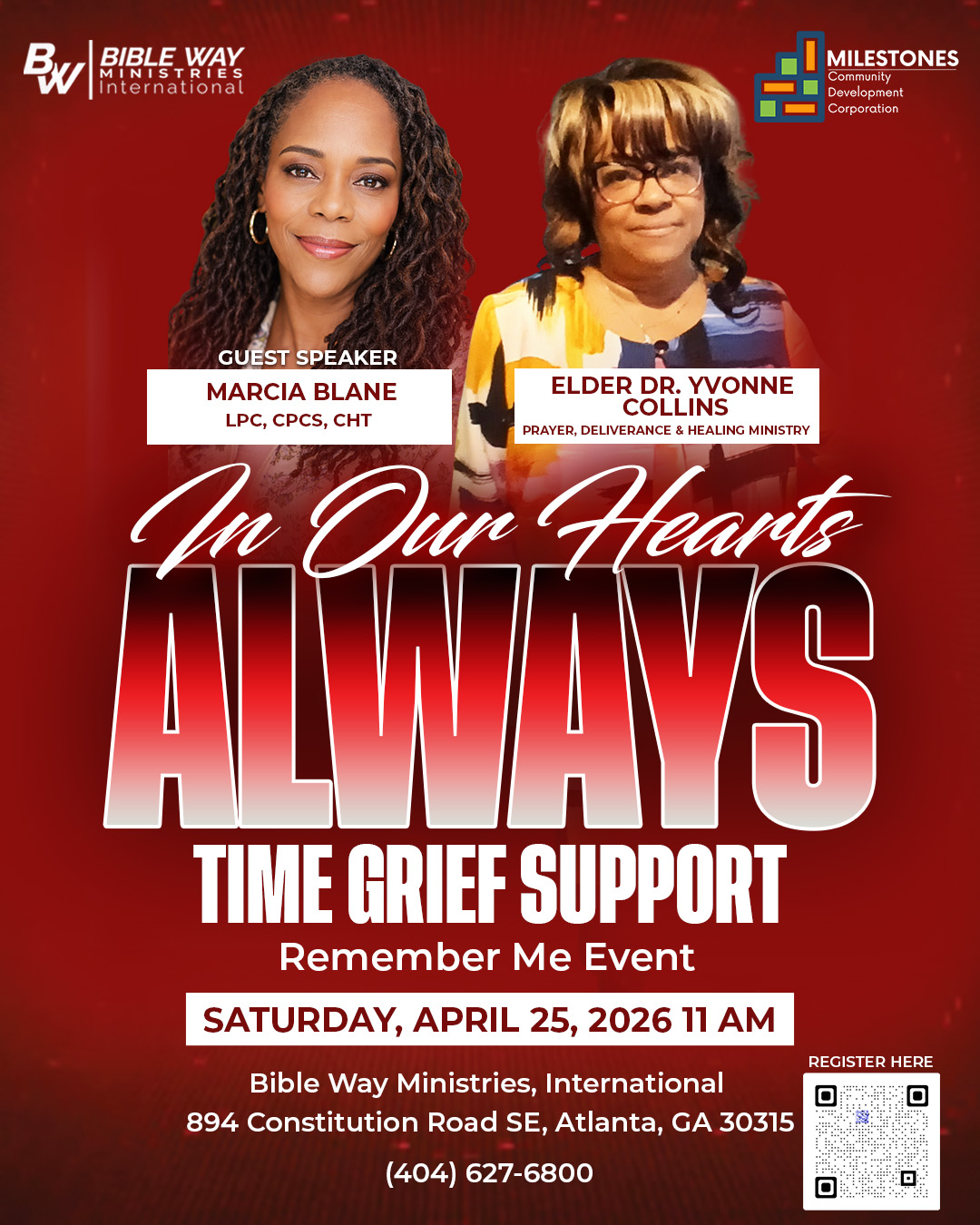 You don’t have to go through the journey of grief alone! We are here for you! The non profit arm of Bible Way Ministries International, Milestones Community Development, hosts our T.I.M.E Grief Support Group annual Remember Me event, to honor the lives of those we have lost. We invite you & the communities of Atlanta to join us for opportunities to learn and be inspired by each other, and two skilled, compassionate, insightful speakers. This year’s theme, IN OUR HEARTS ALWAYS, focuses on the way we navigate remembering those close to us. If you’ve lost someone, or know someone who has, feel free to join us for this FREE event. Free Question & Answer Sessions, Free Food, Freedom from feeling alone and unsure.