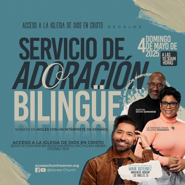 Join Access church on Sunday May 4, 2025 at 10:30 a.m. for our Bilingual Worship Service. Praise & Worship will be led by guest Psalmist Mark Gutierrez followed by a Gospel Message, interpreted in Spanish, by Pastor Brian Keith Edwards.