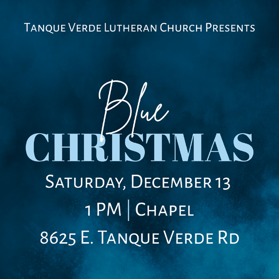 Tanque Verde Lutheran Church Grief Ministry invites you to join us for a Blue Christmas service on December 13 at 1 PM. This service is a time of contemplative meditation that recognizes the reality of loss and grief around the holidays. All are welcome to join for this time of comfort and reflection. To learn more about this service and ministry, contact grief@tvlc.org.