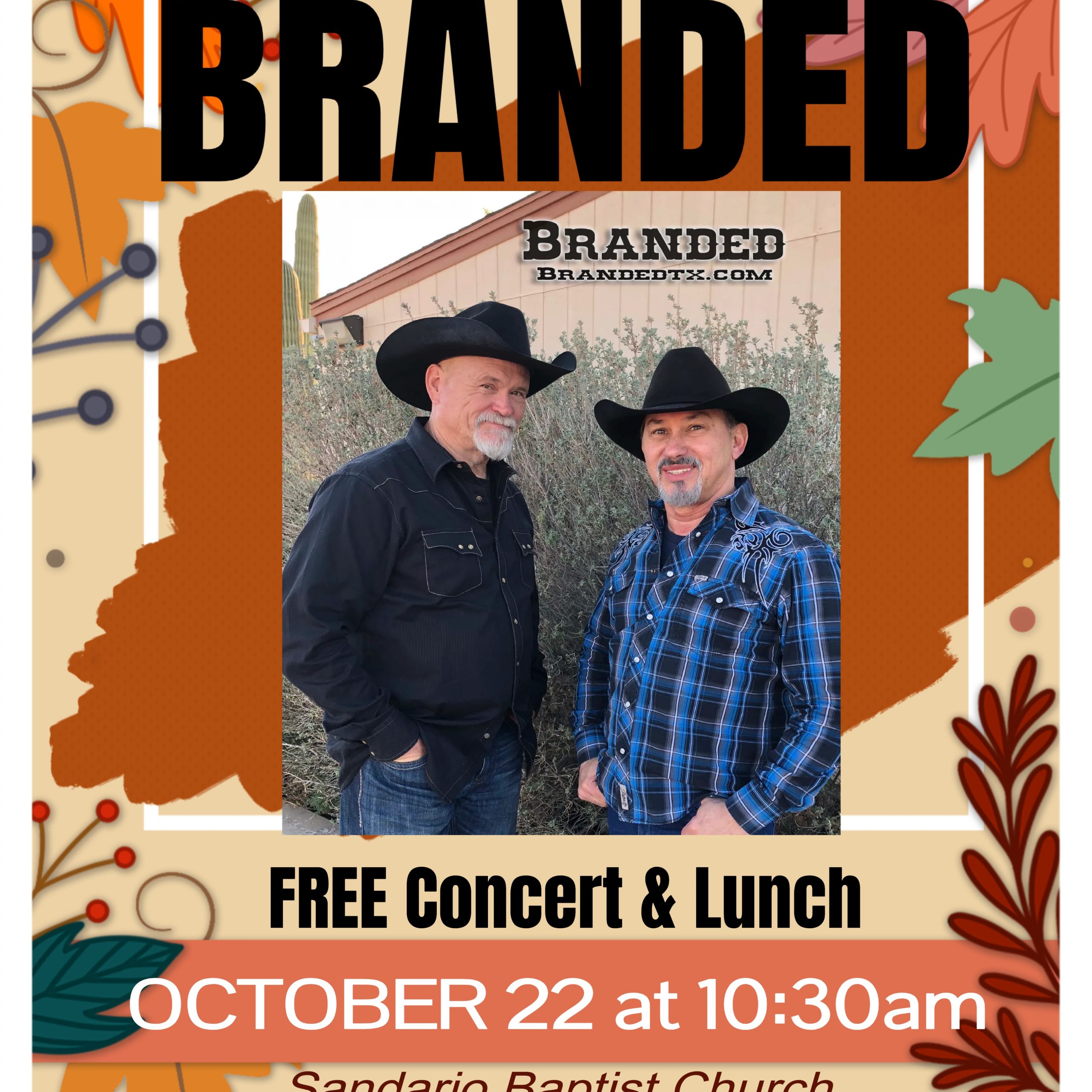 BRANDED, a 7 time Christian Country Duo of the year will be giving a FREE concert at Sandario Baptist Church on Sunday, October 22 at 10:30 a.m. The public is invited to join us for a great time of music and fellowship, and stay for a FREE lunch afterwards.