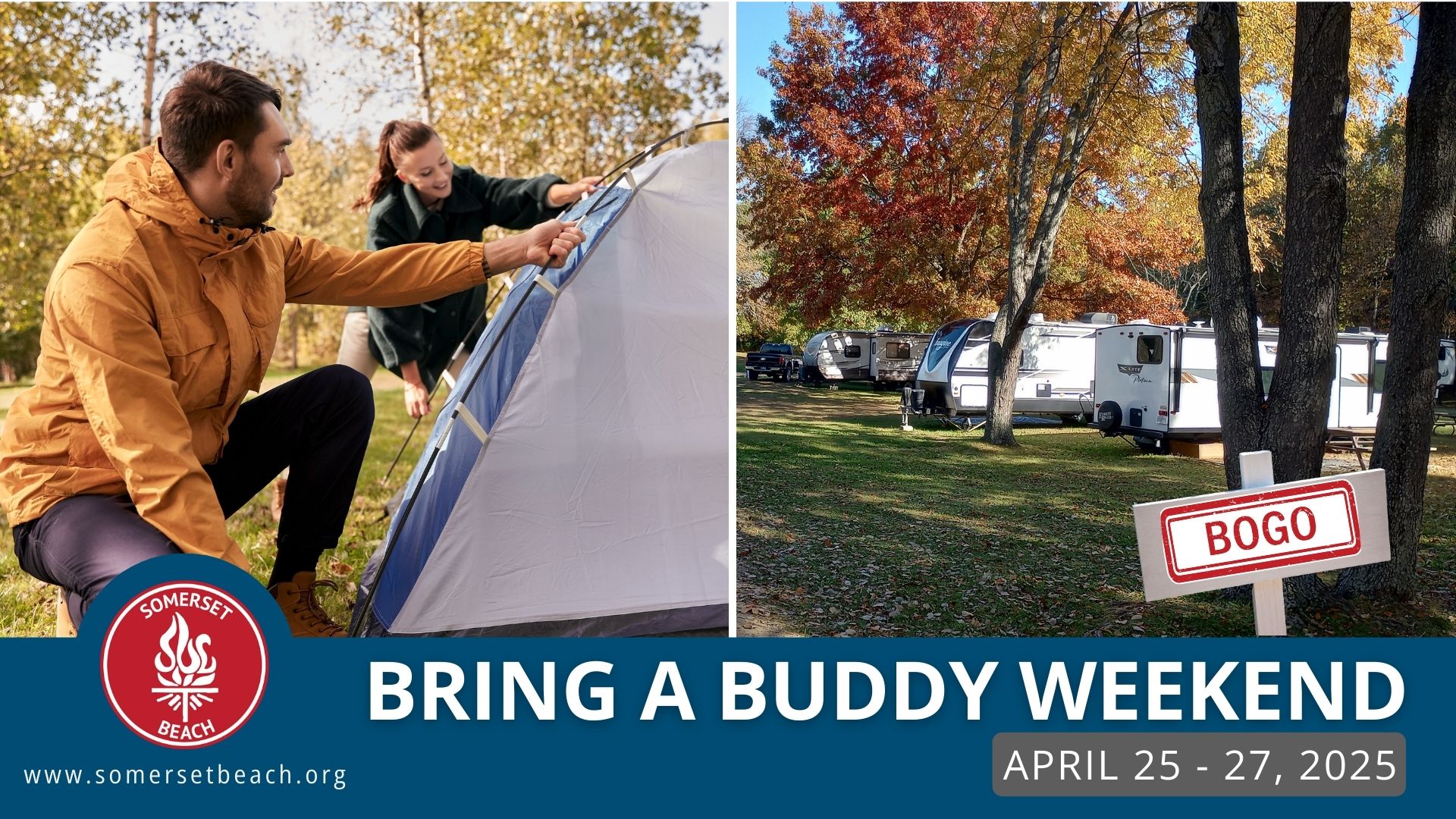 Grab your best buddy and join us at Somerset Beach Campground for a weekend full of laughter, games, and friendly competition! Reserve one campsite and get the second one FREE—just call our office at 517-688-3783 to claim your buddy’s site. Enjoy a packed weekend of fun activities designed for pairs and groups to make unforgettable memories.