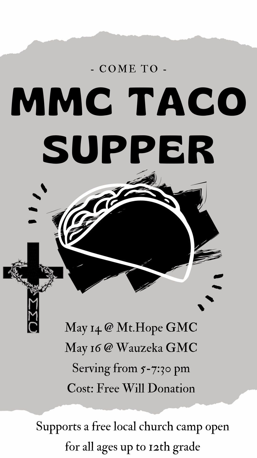We are hosting a taco supper to raise fund for MMC Camp. MMC Camp is a free Christian camp open to all age kids up to 12th grade. This fundraiser give us the funds needed to offer the camp at no cost to all kids attending camp. MMC camp is on the farm with all kinds of activities from hayrides, campfires, bible lessons ,games and new this year will be a dance for all the kids.