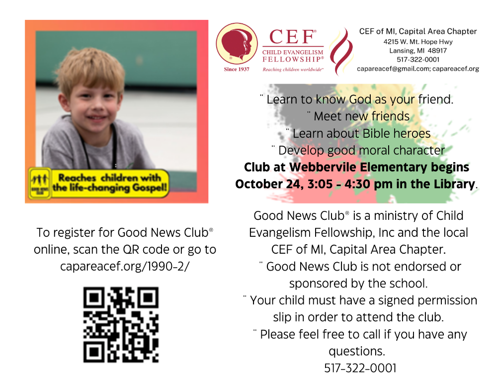 Child Evangelism Fellowship is a Christian organization focused on reaching every child, every nation, every day, with the Good News of Jesus Christ. Good News Club will meet weekly after school on Thursdays. More information and registration can be found on our website.