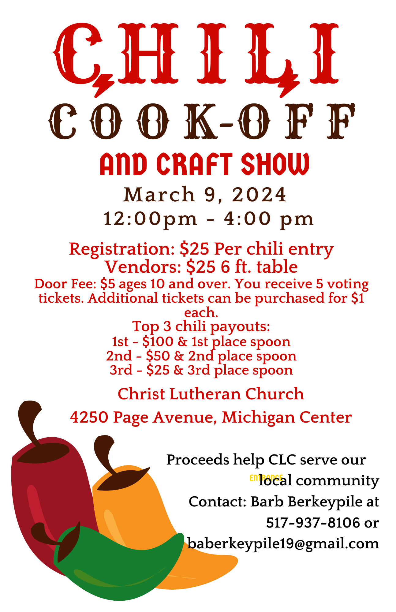 At Christ Lutheran Church, 4250 Page Ave, Michigan Center, MI. There will be Chili tasting and a craft show. $5.00 admission for 10 and older. Includes 5 voting tickets. Noon – 4pm Saturday, March 9. Proceeds to help our local community.