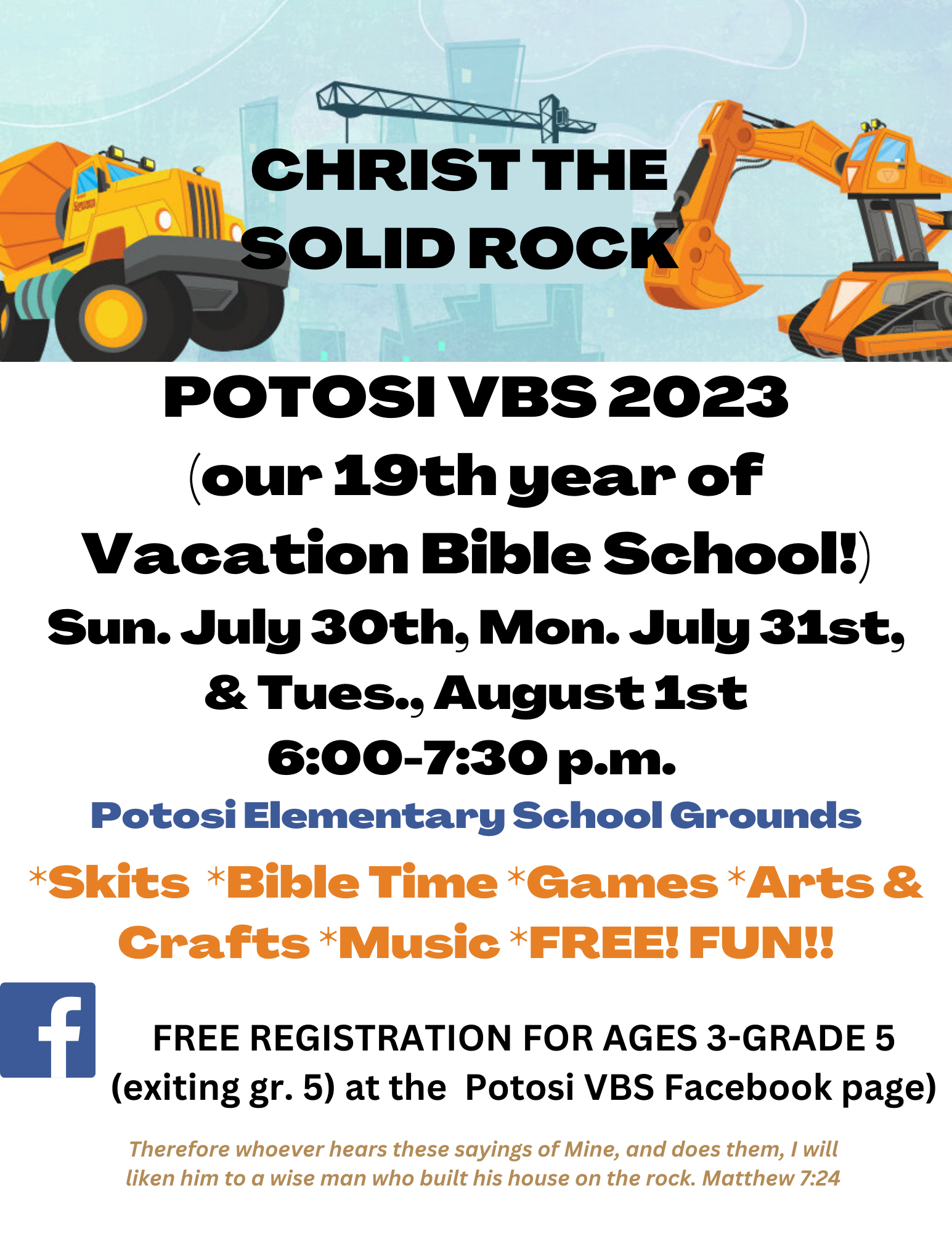Potosi Vacation Bible School is hosting its 19th year of Christian lessons, skits, music, games, crafts, snacks, and fun for Potosi and the surrounding communities. This event is free for children ages 3 through grade 6; families should register on the Potosi VBS Facebook page by July 30th. Potosi VBS theme this year is Christ the Solid Rock: Standing on the Promises of Jesus and will be held on Sunday, July 30th through Tuesday, August 1st from 6:00 to 7:30 p.m. each evening at the Potosi Elementary School.