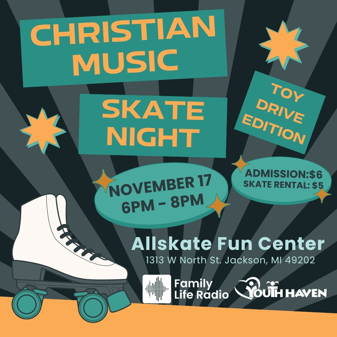 Come join Family Life Radio for Christian Music Skate Night: Toy Drive Edition. Come skate to some of your favorite Christian music, take a picture at the Family Life Radio Photo Booth, and bring a toy to donate to the kids at Youth Haven!
