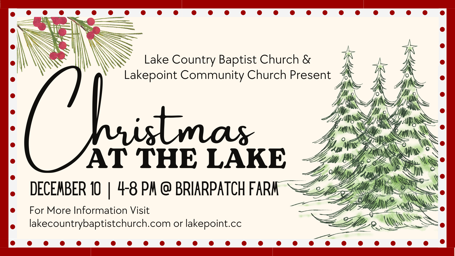 Christmas at the Lake is a free, family friendly, fun event! There will be sleigh rides, live nativity, Food Truck by Dough Daddy, (The only fee will be what you buy here) Cookies and Cocoa, Smores by the campfire! Two Dove award winning singers, Brian White and Karyn Williams will be giving us an amazing Christmas concert from 6 to 8pm. Kids Zone will be happening from 4 to 5:30pm, where there will be Santa and the Mrs. as well as crafts for the children. Our mission will be Putnam Christian Outreach! This event will be held at the Briarpatch Farm, 725 Pea Ridge Rd, Eatonton, GA 31024. It is being presented by Lake Country Baptist Church and Lake Point Community Church both of Eatonton.