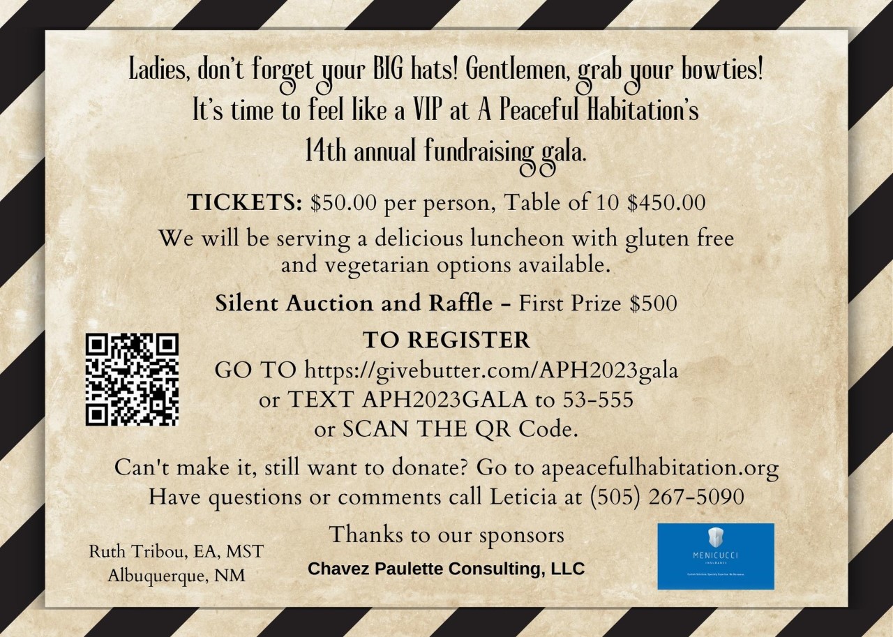 A Peaceful Habitation’s 14th Annual Gala! Our largest fundraising event. Event will be at the Embassy Suites of Albuquerque. We will have inspiring testimonies, mini-Kentucky Derby, great food and music; We will have an amazing silent auction. A raffle, 1st Prize is $500, 2nd Prize is Soap Making class, 3rd Prize is $150!
