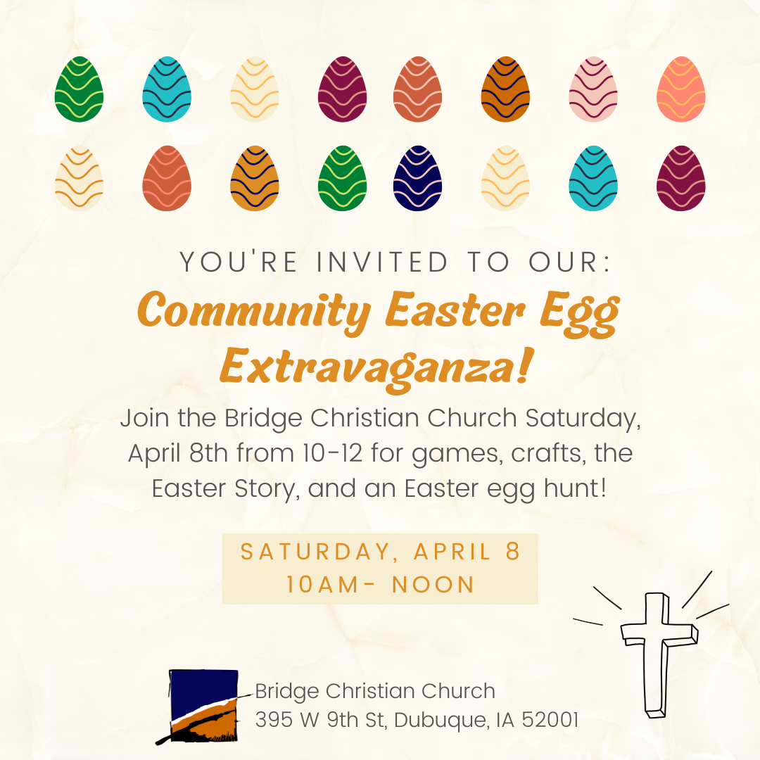 Join the Bridge Christian Church Saturday, April 8th from 10-12 for games, crafts, the Easter Story, and an Easter egg hunt!