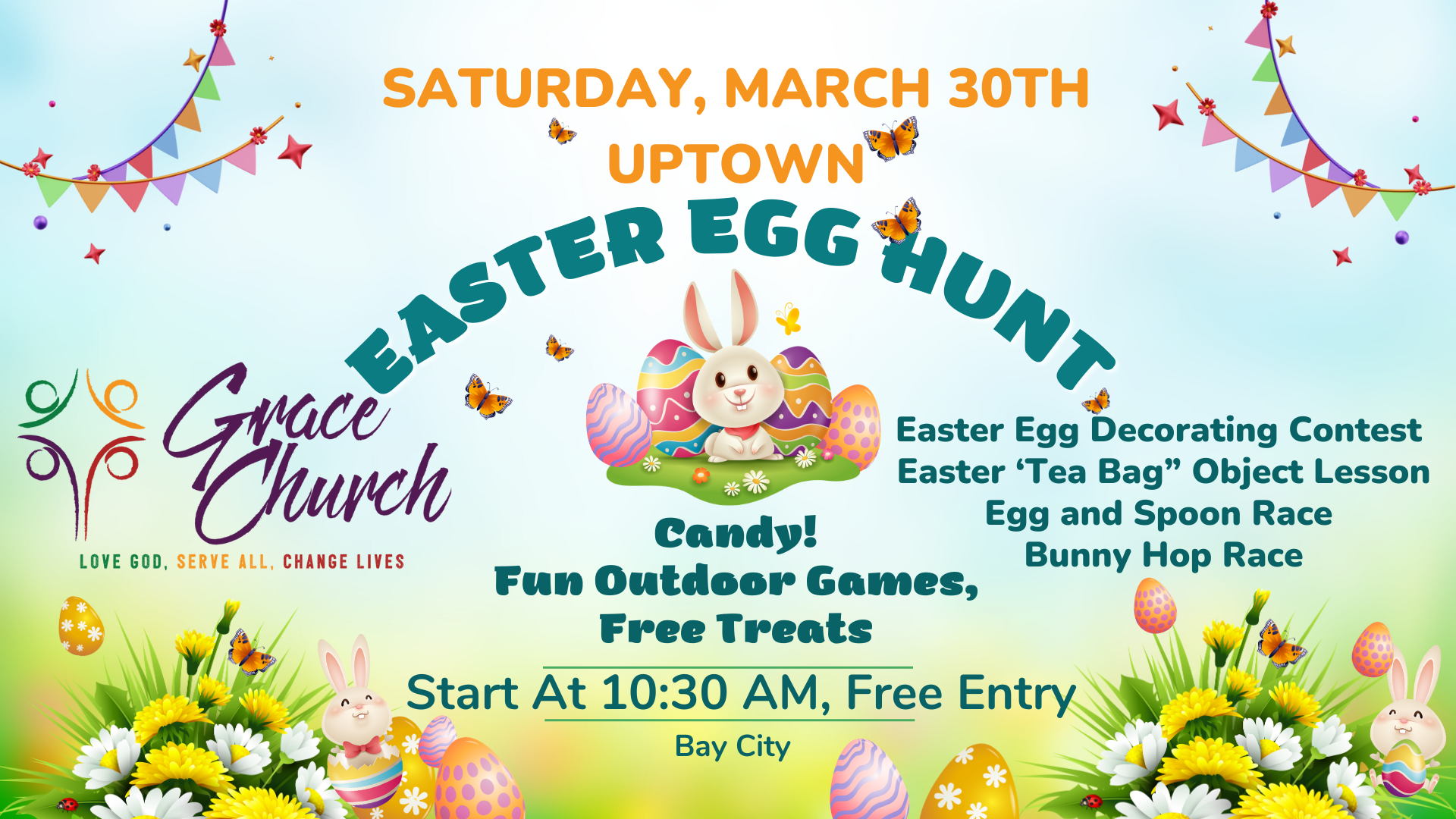 Join us in a celebration of Easter with a Community Easter Egg Hunt, Easter Egg Coloring Contest, Easter ‘Tea Bag’ Object Lesson, Egg and Spoon Race and Bunny Hop Race! We will have candy and fun from 10:30-12:00 on March 30th at Bay City’s Uptown area. Entry is FREE!