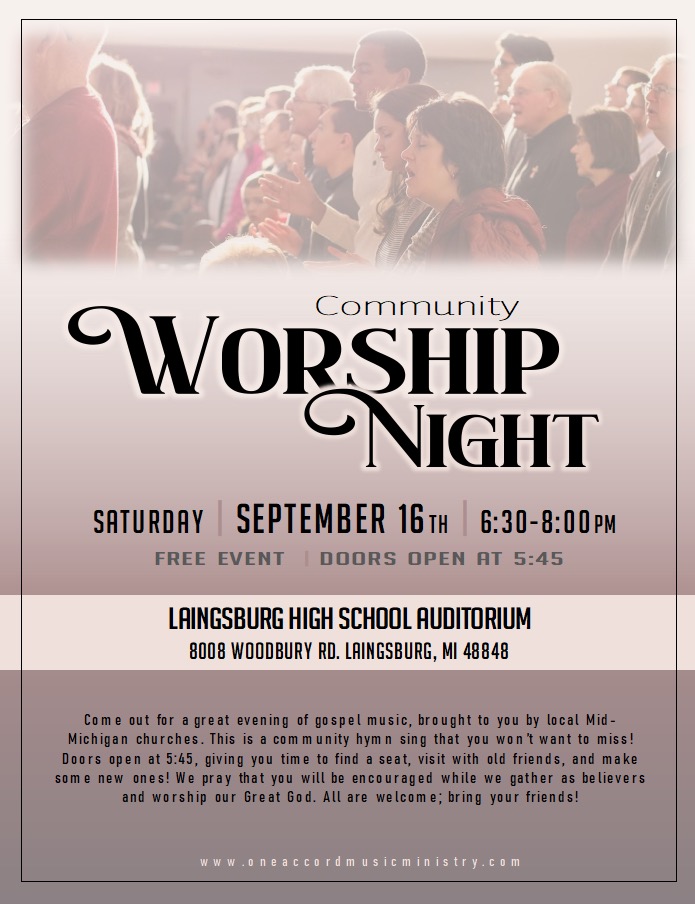 All are invited to join with other believers from around Mid-Michigan for a time of worship together at the Laingsburg High School at 6:30 pm on Saturday, September 16, Doors open at 5:45 pm.