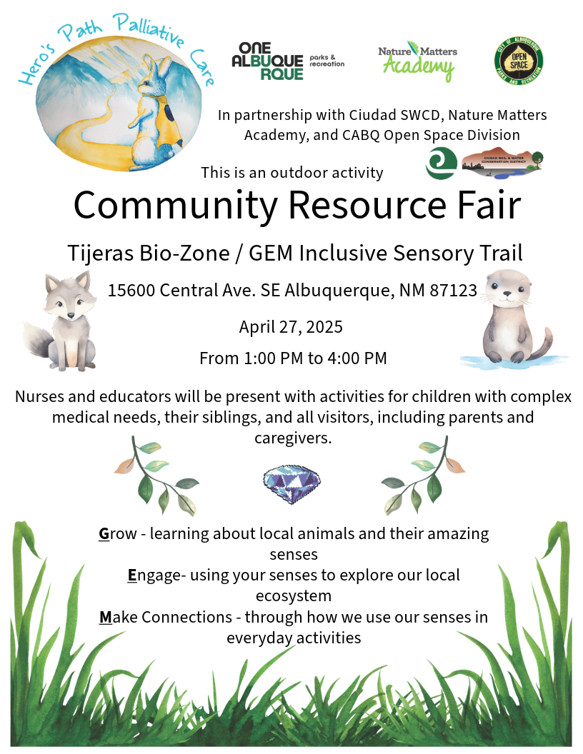 Hero’s Path Palliative Care is excited to invite you to attend the Community Reource Fair, on April 27 at the new Tijeras Bio-Zone. In addition to fun and educational activities, this event will allow families to learn more about the resources in their community and the new GEM Inclusive Sensory Trail! Lots of fun for the whole family!