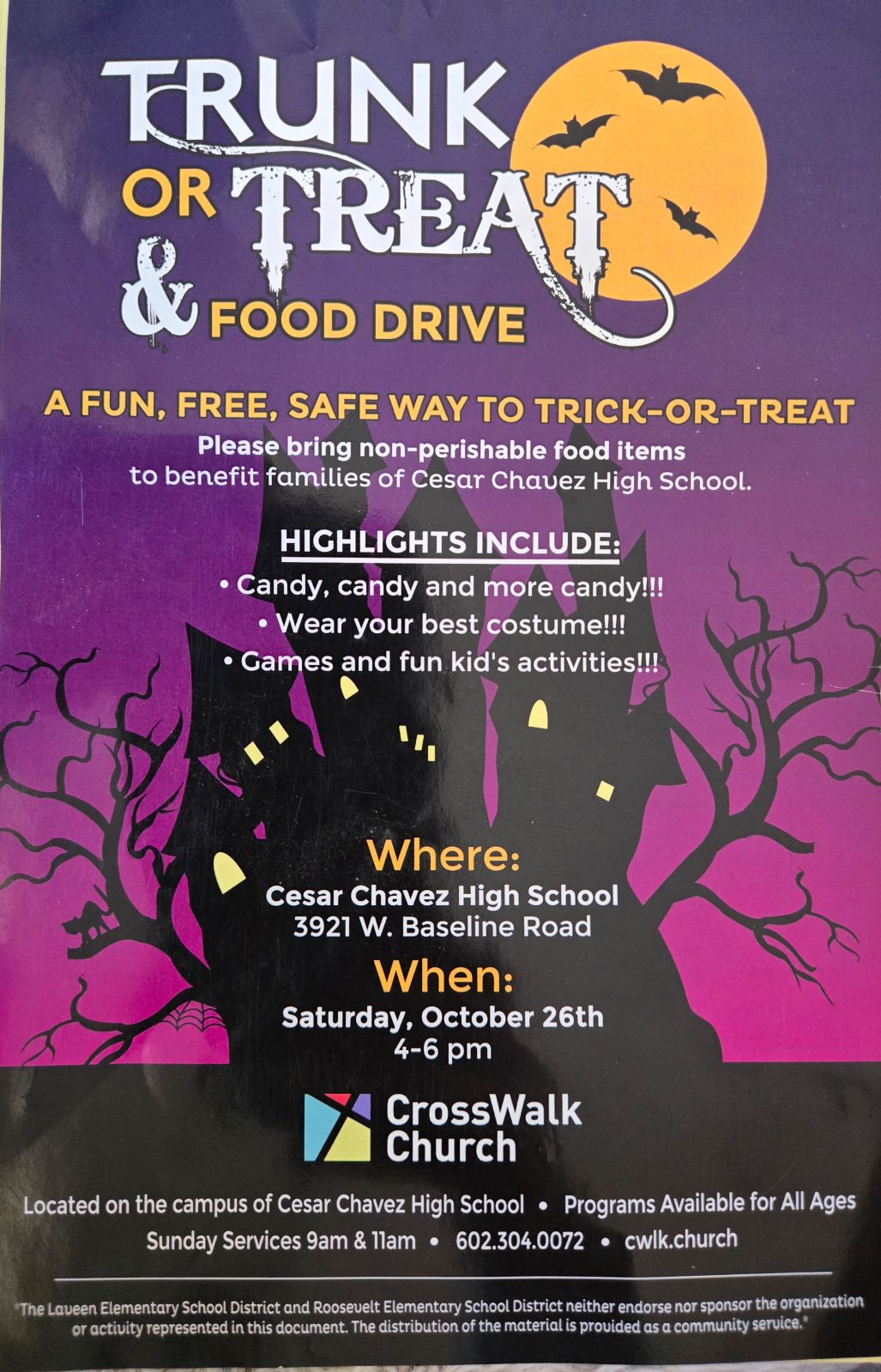 A fun, free, safe way to trick-or-treat. CrossWalk Church is hosting Trunk or Treat and a food drive at Cesar Chavez High School on Saturday, October 26 from 4-6pm. Please bring non-perishable food items to benefit families of Cesar Chavez High School.
