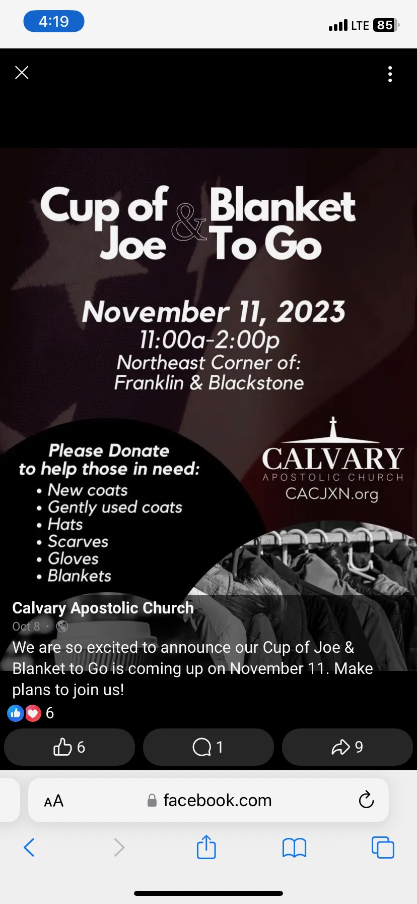 An event in Downtown Jackson to give back to the community and those in need for the upcoming cold season. We will be providing a hot cup of coffee, along with New or gently used coats, hats, scarfs, gloves, and blankets. We will be located on the northeast parking lot of Blackstone St and Franklin St across from the Interfaith Shelter. The event is organized by Calvary Apostolic Church (260 w prospect St, Jackson, MI).
