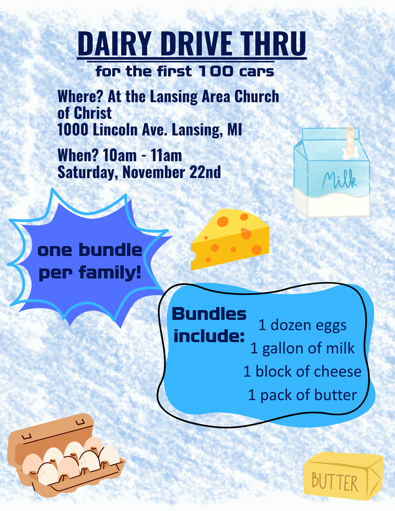 First 100 cars will receive 1 gallon milk, 1 carton eggs, 1 block of cheese, 4 sticks of butter – free.