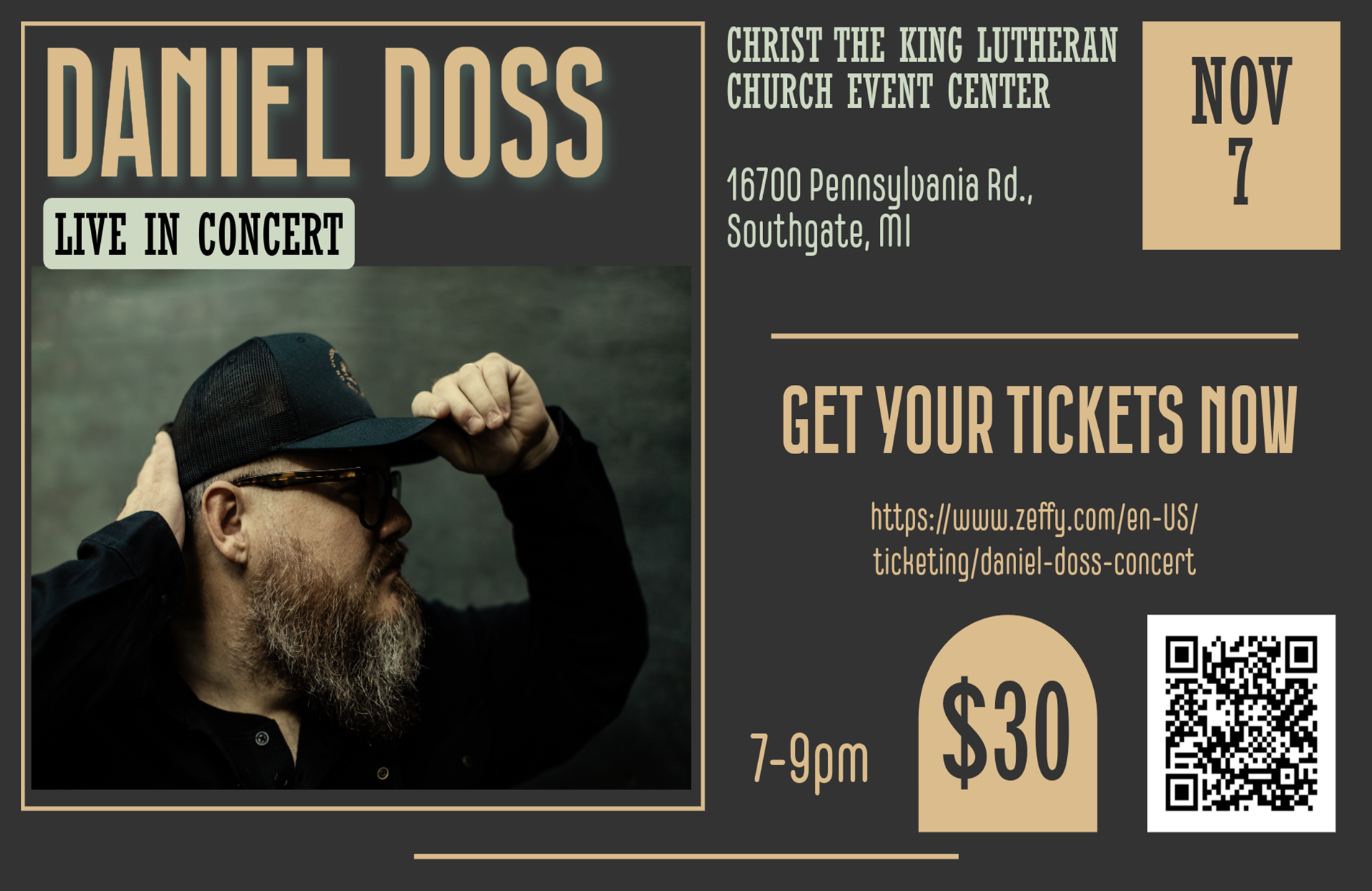 COMING NOVEMBER 7TH! DANIEL DOSS, IN CONCERT, Friday, November 7th at 7:00 p.m. at Christ The King Lutheran Church’s Pennsylvania Rd Event Center, 16700 Pennsylvania Rd, Southgate, MI 48195. Daniel Doss is an artist, worship leader, and songwriter. He currently leads at New Vision Baptist Church of Murfreesboro, TN, and also travels, doing various events and concerts throughout the year. Some of his songs include Revival, Same Gospel, Lay Your Burdens Dwon, and There Is a Day Coming. For more information on his ministry, visit www.danieldossmusic.com. Ticket cost is $30, or free for 10 and under, with the purchase of an adult ticket. Free parking; cash concessions. For more information and to purchase tickets, visit www.ctk.me.