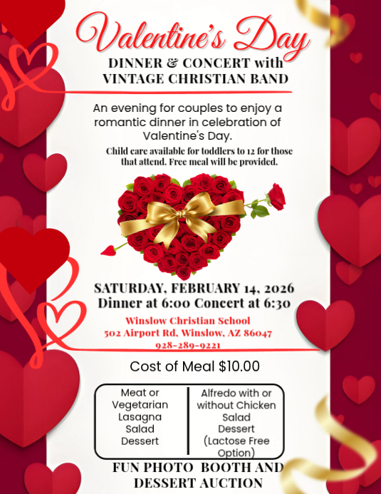 Valentine’s date night with dinner, dessert, and Christian concert with Vintage Christian Band. Childcare provided up to 12 years old with free food.