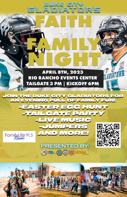 91.5 FM Family Life Radio and Duke City Gladiators Football invite you to a FREE FAITH & FAMILY TAILGATE PARTY before the Kickoff Game!