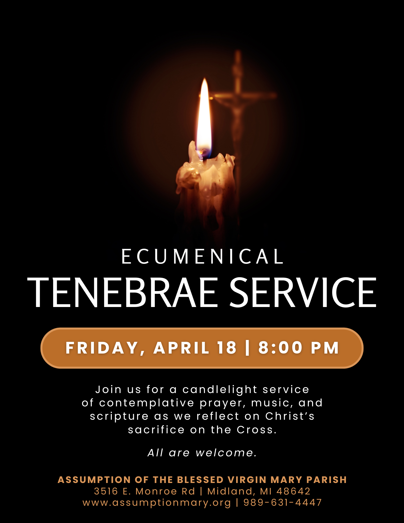 Join Assumption Parish in Midland for an Ecumenical Tenebrae Service on Good Friday, April 18, at 8:00 pm. Tenebrae – meaning “shadows” or “darkness” – is a candlelight service of contemplative prayer, music, and scripture reflecting on Christ’s sacrifice on the Cross.