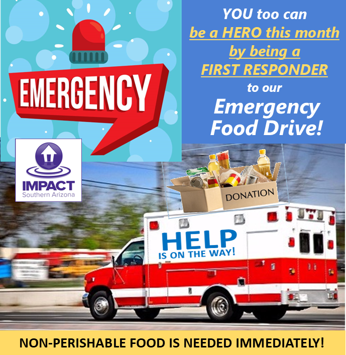 IMPACT of Southern Arizona’s food bank needs have skyrocketed! Their nonperishable pantry shelf items are rapidly depleting as the number of families served each month continues to increase. IMPACT provides more than 50,000 pounds of food to 800 families every month living in Pima and Pinal County. Every nonperishable food item that you can donate makes a huge difference. They need your help TODAY!
