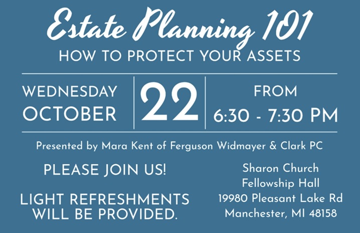 It is never too early to start thinking about a plan to protect your family and your assets. Sharon Church invites you to a one-hour educational program to help you begin the process. There is no cost, nothing to buy, and no registration necessary. Just come to learn.