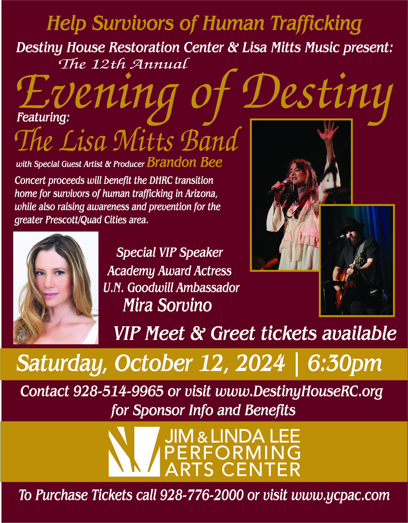 The 2024 Annual Evening of Destiny is a benefit concert to promote awareness on human trafficking locally in Arizona and will also benefit the future home of a local transition program in Prescott for survivors, Destiny House Restoration Center. Academy Award and Golden Globe Award-winning actress and United Nations Goodwill Ambassador Mira Sorvino will be the VIP speaker for this year’s 4th event in Prescott. Ms. Sorvino is best known for Romy & Michele’s High School Reunion, Mimi, Lulu on The Bridge, Sound of Freedom, and the 2023 season of Dancing with the Stars, and her work with Amnesty International’s “Stop Violence Against Women” campaign from 2004-2008. She testified before the U.S. Senate on human trafficking and has worked to reform state laws on trafficking.