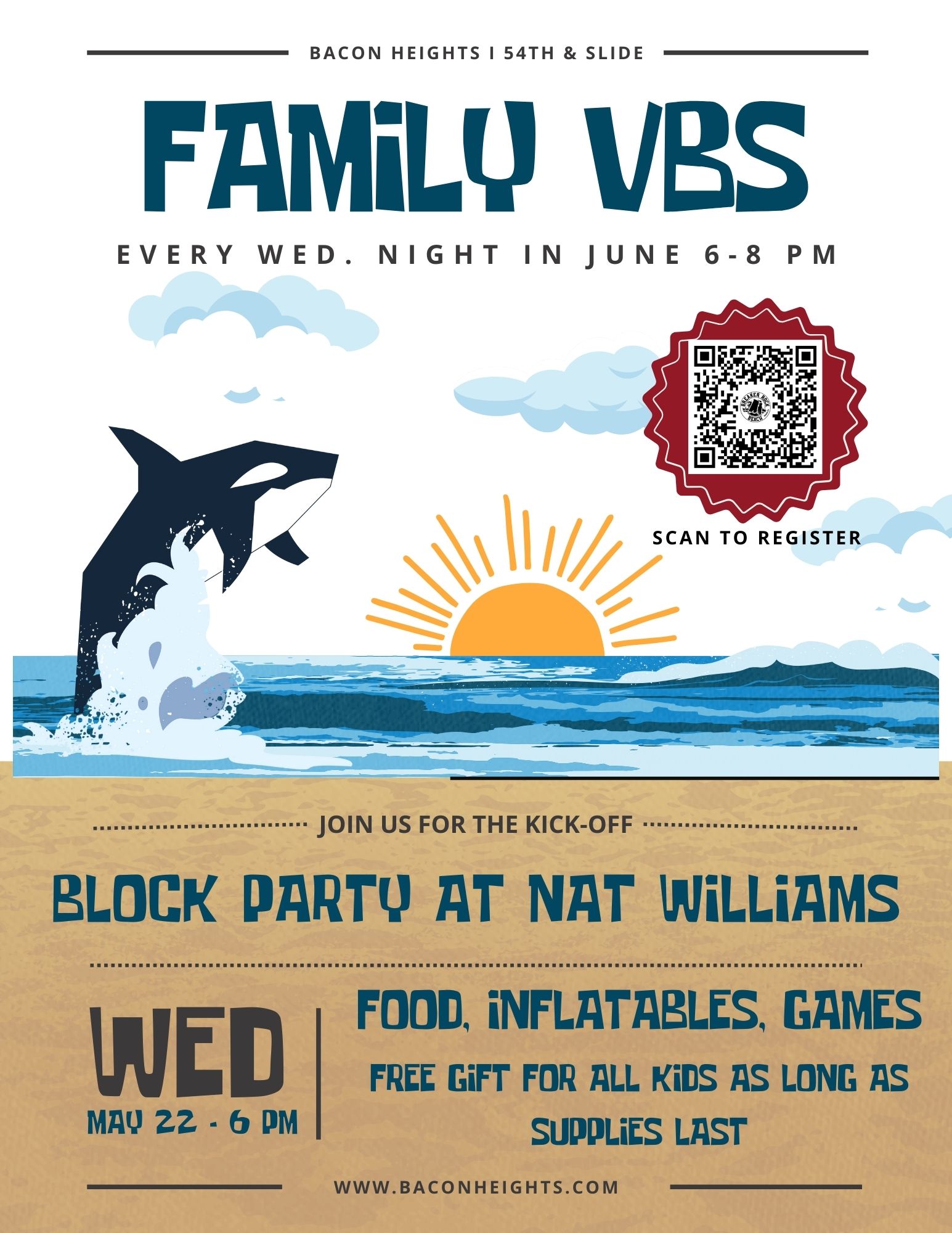 We have taken the traditional VBS and flipped it on it’s head!  Family VBS is a high energy, immersive and fun experience for the entire family!! Music, doorprizes, games, free meal & Family  Mission Project!