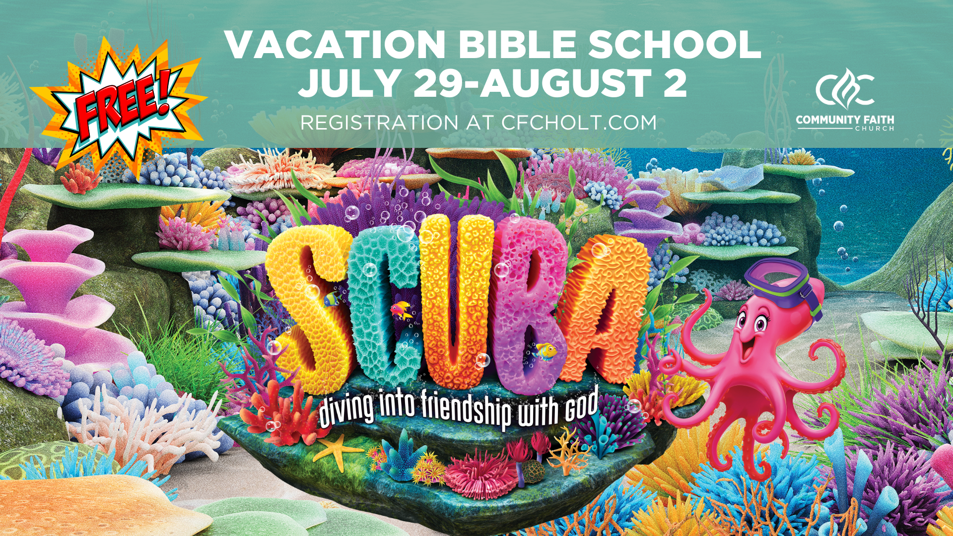 Your kid(s) entering Kindergarten through Fifth Grade are invited to join us for “Scuba” Vacation Bible School (VBS) July 29-August 2 from 6:00-8:30 p.m. at Community Faith Church! At Scuba VBS, kids will dive into friendship with God. “Scuba” is filled with awesome Bible-learning experiences that kids can see, hear, and touch! Hands-on science experiments, team-building games, unforgettable Bible songs, and tasty treats are just a few of the standout activities that help faith flow into real life. (Kids might get a little messy. Be sure to send them in play clothes and sturdy shoes!) Plus, we’ll help kids discover how to see evidence of God in everyday life- something we call “God Sightings!”