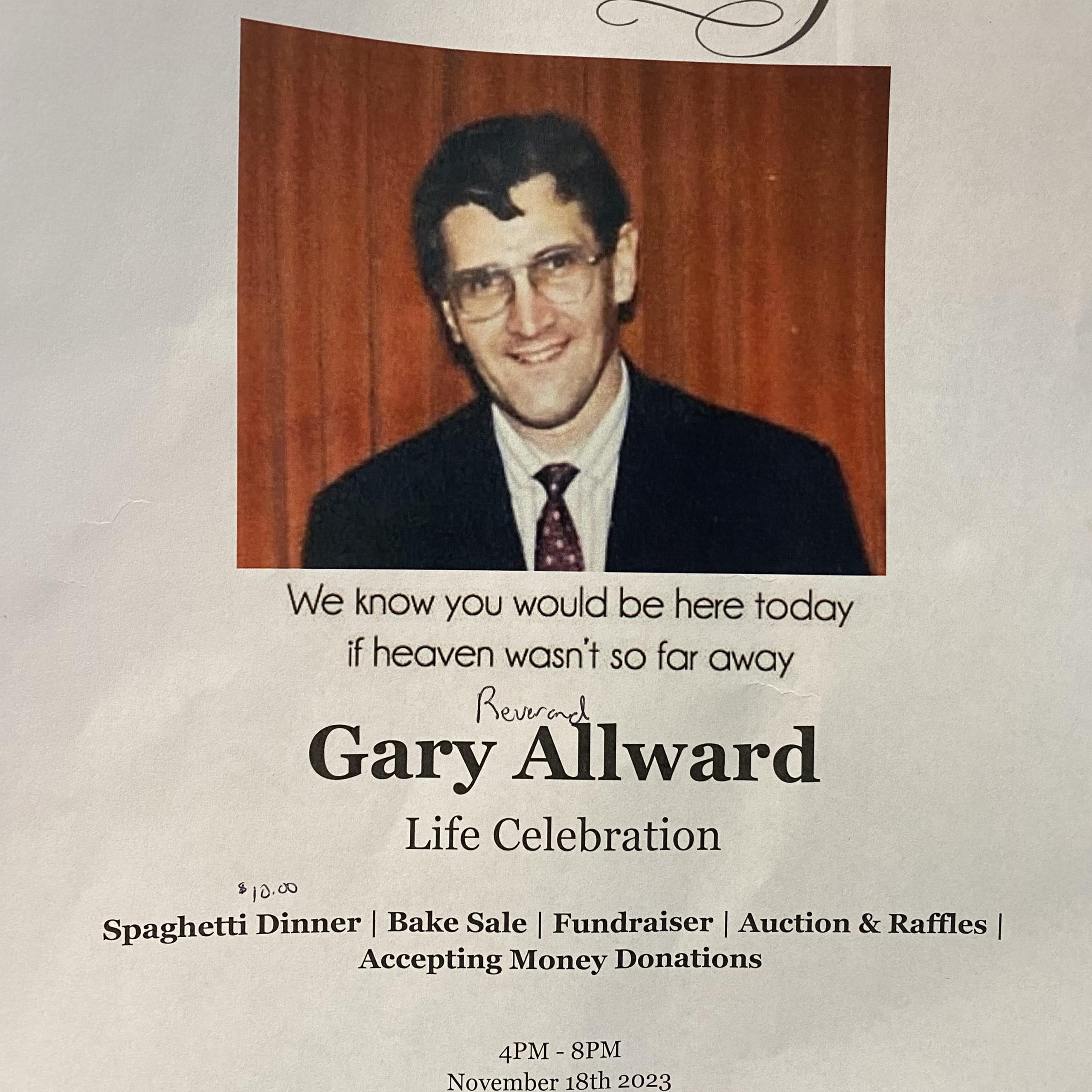 Please come and celebrate the life of the late Rev. Gary Allward, who served his flock faithfully for over thirty years. Spaghetti Dinner, Bake Sale, Fundraiser, and Auction/Raffles.