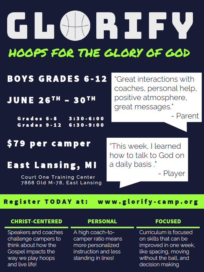 GLORIFY is a Christ-centered basketball camp in Lansing/East Lansing for boys going into middle or high school (grades 6-12). Join us for a fun week of great basketball and incredible speakers – players will be challenged to do ALL things for the glory of God! Register today at www.glorify-camp.org