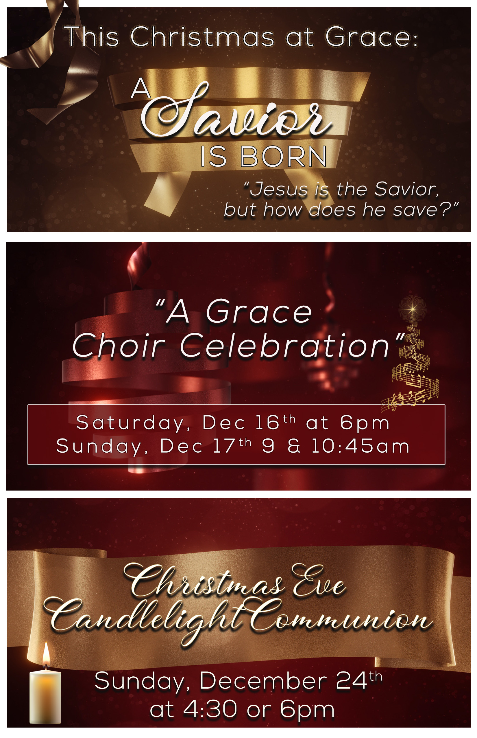 GRACE COMMUNITY CHURCH INVITES EVERYONE TO JOIN THEM FOR THEIR CHRISTMAS CELEBRATIONS. THE GRACE CHOIR WILL BE PRESENTING “A SAVIOR IS BORN” ON SATURDAY EVENING, DECEMBER 16, AT 6:00 AND AGAIN ON SUNDAY MORNING, DECEMBER 17, AT 9:00 AND 10:45.