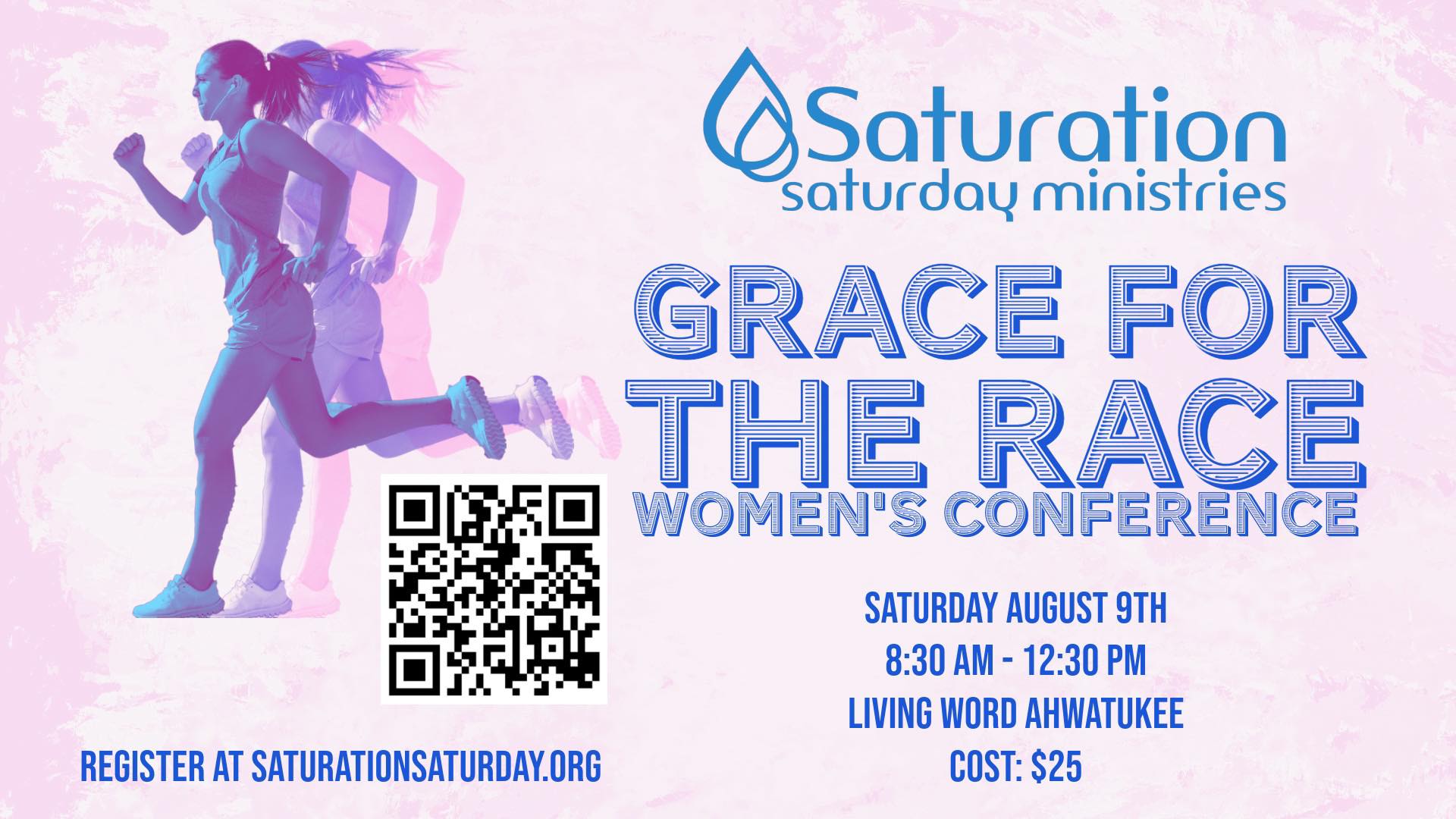 Saturation Saturday is hosting the Grace for the Race Women’s Summer Conference, with 5 amazing speakers: Pastors Tammy Zubeck, Pastor Erica Moore, Pastor Barb Pruitt, Geriece Hightower, and PA Patterson.