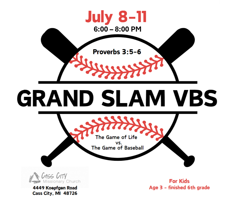 Kids Age 3-completed 6th Grade are invited to experience The Game of Life vs. The Game of Baseball at Cass City Missionary Church, Monday-Thursday, July 8-11 from 6:00-8:00 PM each night. If you have a Ball Glove, bring it along (with your full name on it)! Former Professional Baseball Player, Darrel Hetzler is coming to lead us to explore Proverbs 3:5-6. The BIG GAME is Thursday night (everyone invited). Bring a lawn chair. See you here! 🙂