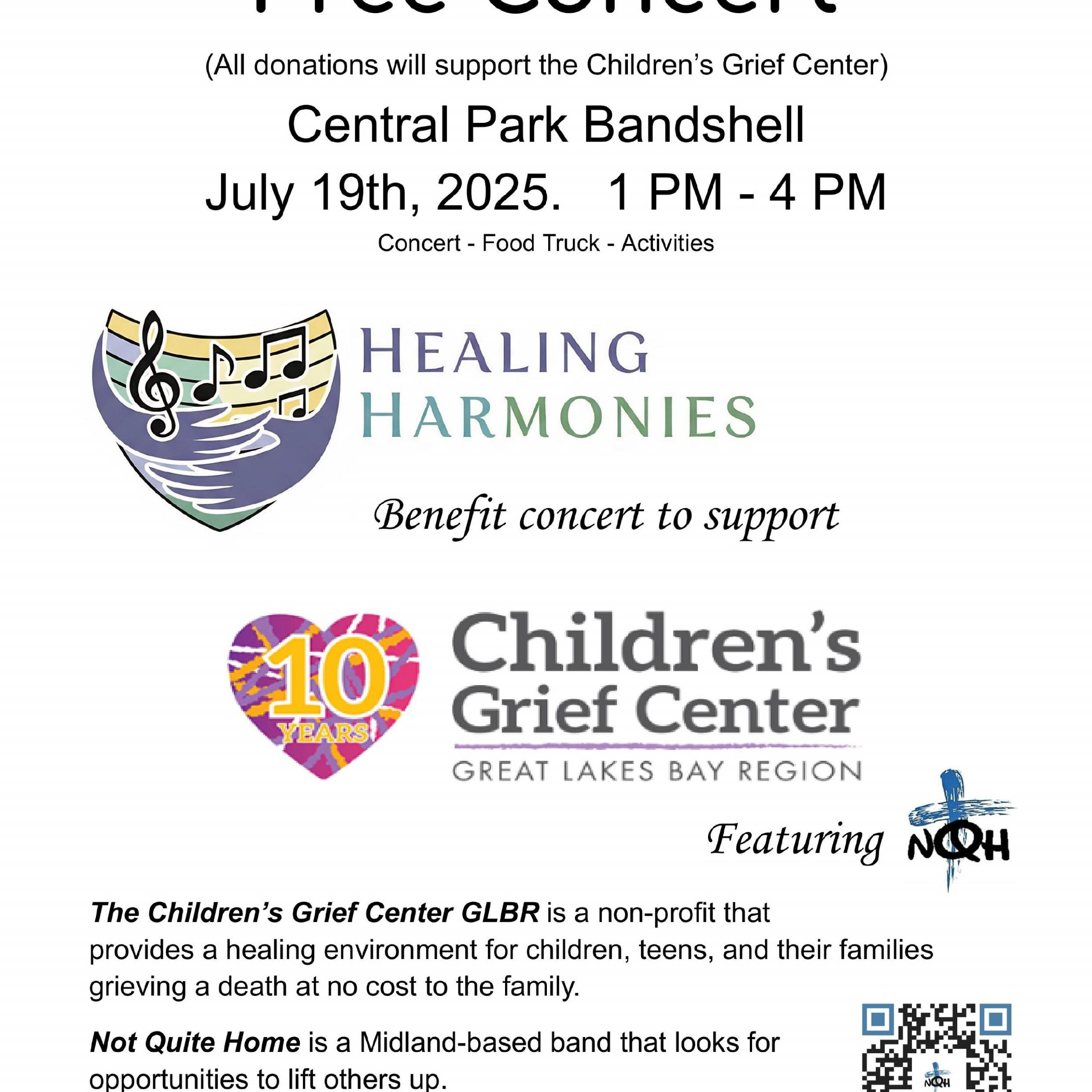 Free concert given by the Christian band “Not Quite Home” to support the Children’s Grief Center (Great Lakes Bay Region). The Children’s Grief Center is a non-profit organization that provides a free healing environment for children, teens, and their families grieving a death. “Not Quite Home” is a Midland Michigan based band that performs their own original contemporary Chrisitan music in an effort to lift others up. “Not Quite Home” will be joined by music artist Andy Scott.
