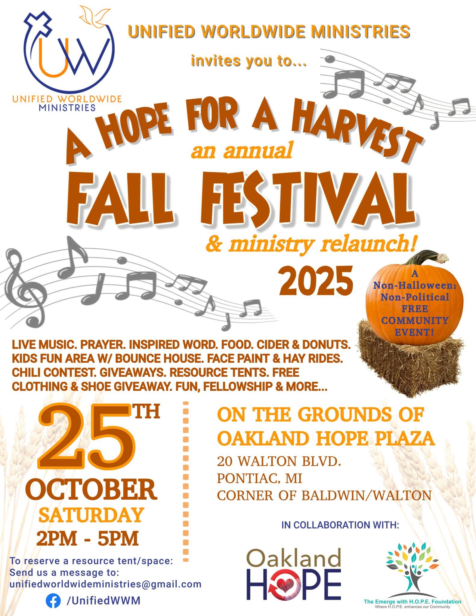 We are bringing Jesus and the cider mill to our inner city community! On Saturday October 25th from 2pm-5pm in the Oakland Hope parking lot at 20 walton Boulevard we will host our annual Hope for a Harvest event! This is a free event to our community lead off by Unified worldwide ministeries and dedicated sponsors from local businesses, churches and organizations. This event will have live praise and worship from an array of different gospel genres. Prayer, a Hayride, cider & donuts, a Chili Cook-Off, Bounce House, games, raffle prizes, clothing giveaway, local vendors and much more! Please join us for a fun filled afternoon filled with fellowship and fun in our Pontiac community!