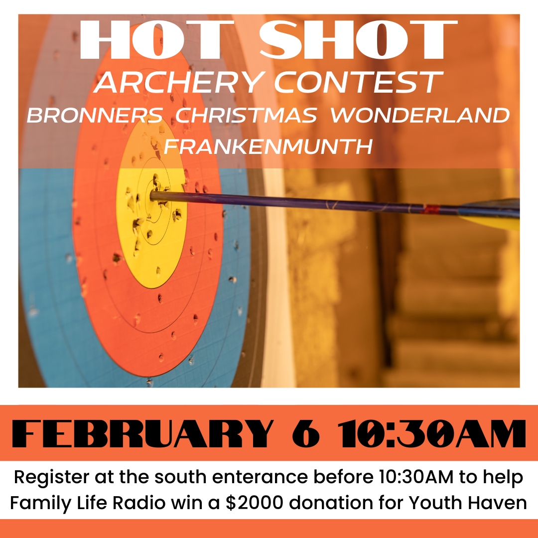 Family Life Radio’s Daniel Balzer is competing in Bronner’s 17th Annual Hot Shot Local Media Celebrity Archery Contest for Charity. Daniel gets extra points for every person who shows up and registers in support before 10:30 am. If he wins, Bronner’s will donate $2000 to the charity of his choice… in this case, Youth Haven.