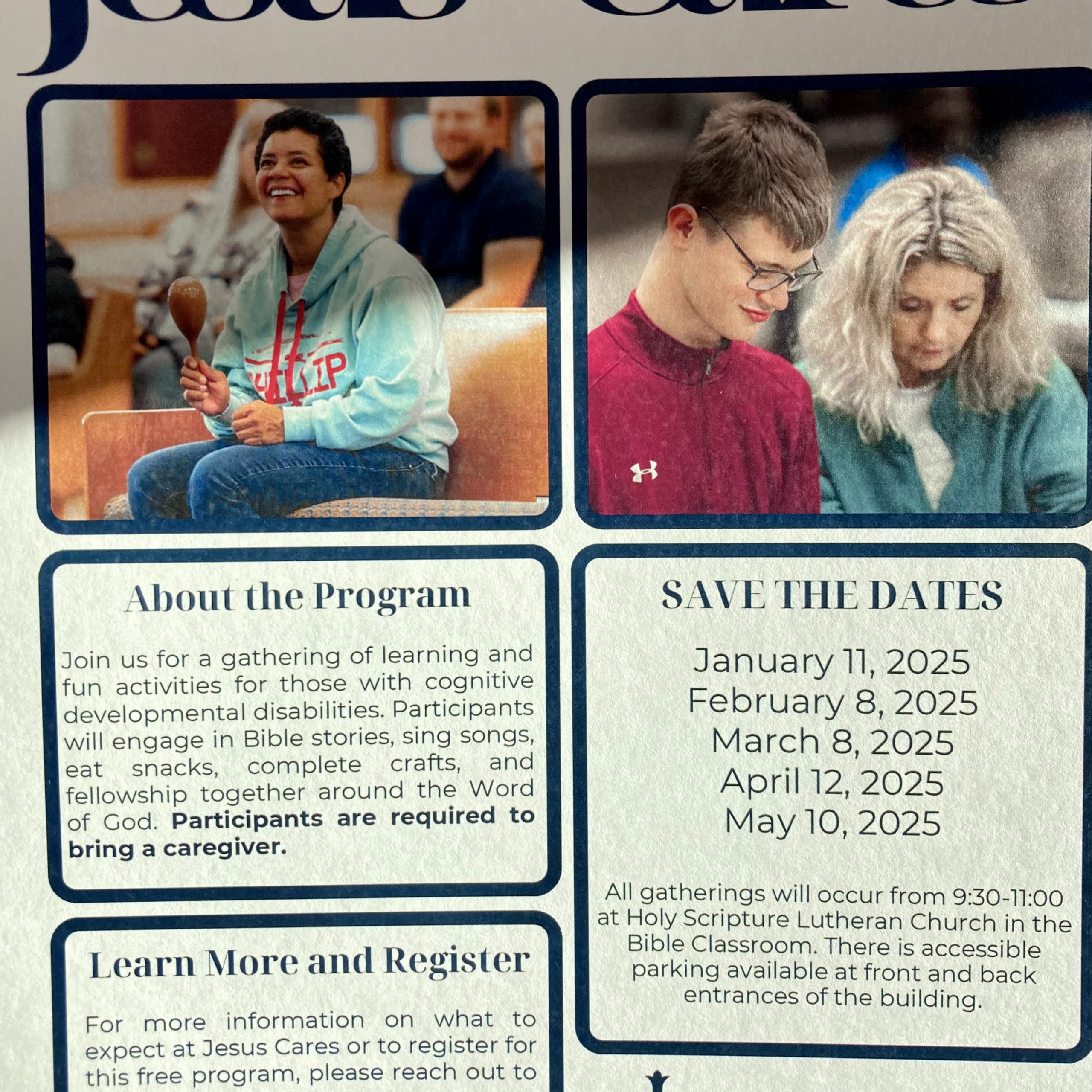 A gathering of learning and fun activities for those with cognitive development disabilities. Participants will engage in bible stories, sing songs, eat snacks, crafts and fellowship together around the Word of God. Participants are required to bring a caregiver.