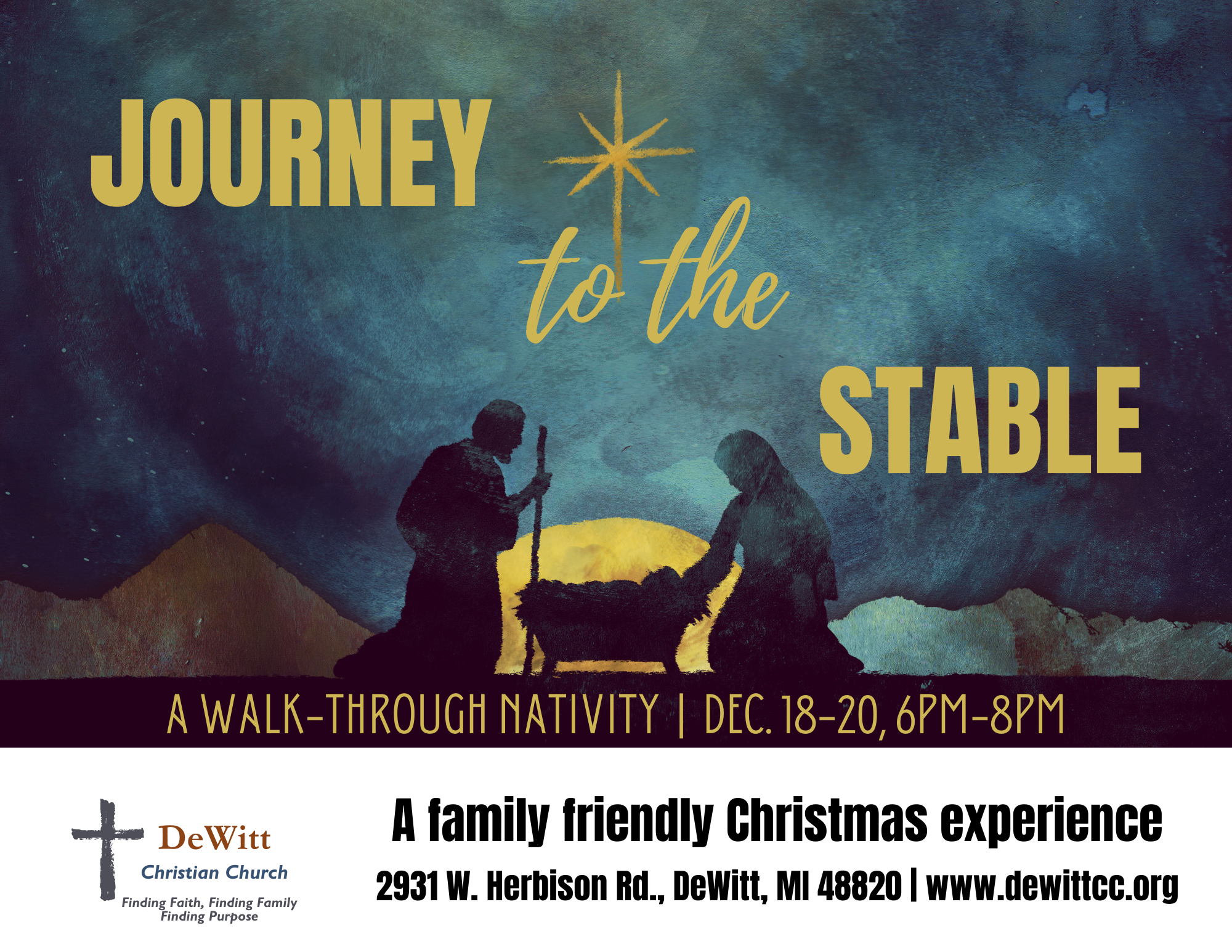 You are invited to experience the story of Christmas as you and your family Journey to the Stable to see the miracle of Jesus’ birth. You will visit with Mary and Joseph, the Wise Men, and the Shepherds on your Journey to learn about the Christmas Story and the birth of the Savior. After you finish your Journey, you and your family will enjoy Hot Chocolate and Cookies, and your kids will be given age-appropriate gifts.