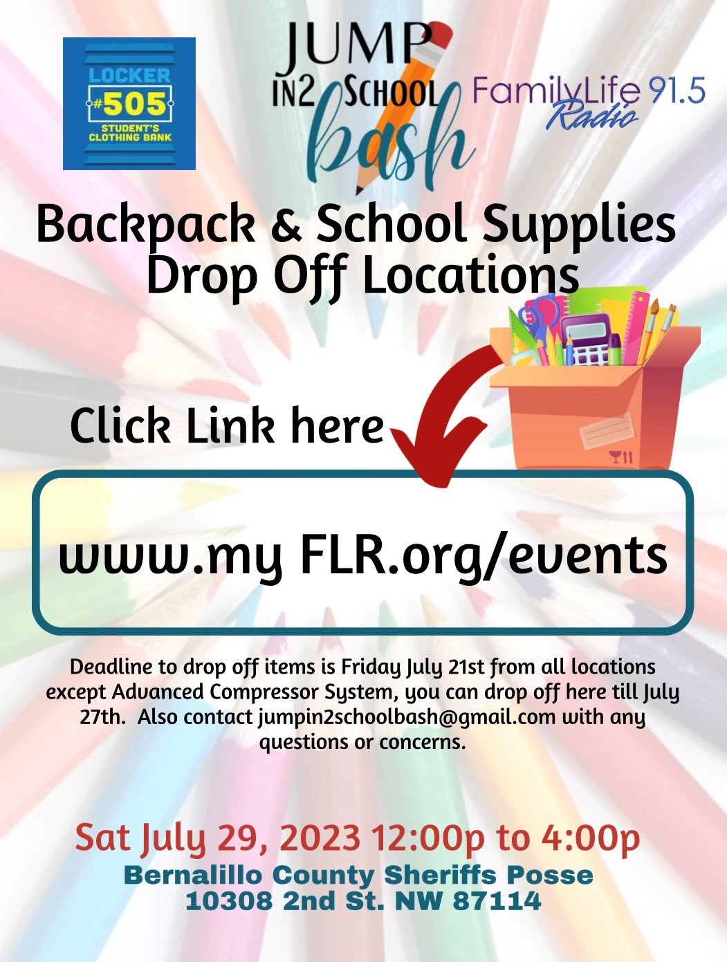 Jump In2 School Bash Event is collecting Backpacks, Schools Supplies, Hygiene Item & Socks for the Event on July 29th at 12noon-4pm at Bernalillo County Sherriffs Posse-10308 2nd St NW 87114. These items will go to the non-profit, Locker #505: Student Clothing Bank; They serve the greater metro Albuquerque area for students needing clothing to go to school!