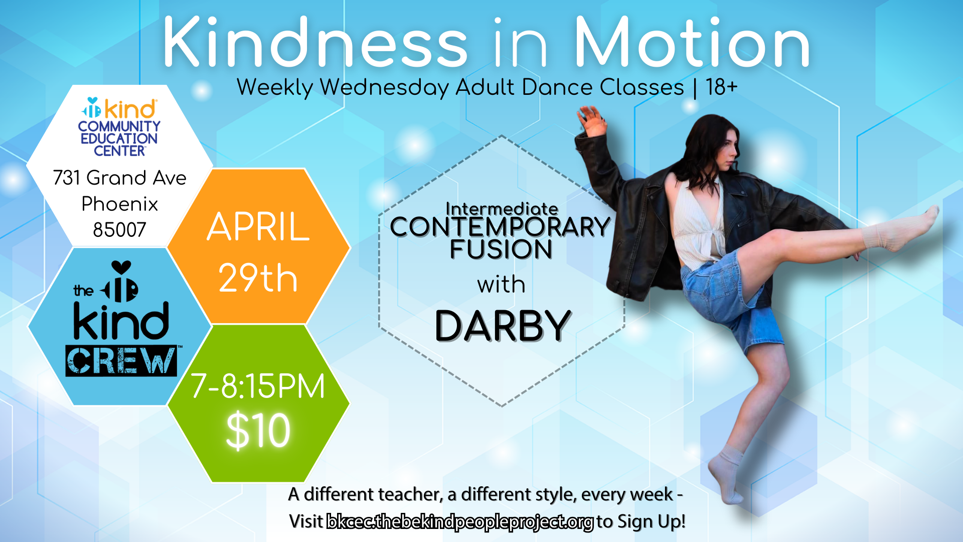 Kindness in Motion is an adult dance class (18+) featuring a different style and teacher each week. This week is Intermediate Contemporary Fusion with instructor Darby offering a fun, open space to explore various dance forms. Perfect for all skill levels! It’s an opportunity to learn, improve, and express yourself in a supportive environment. Class will be 7 – 8:15pm