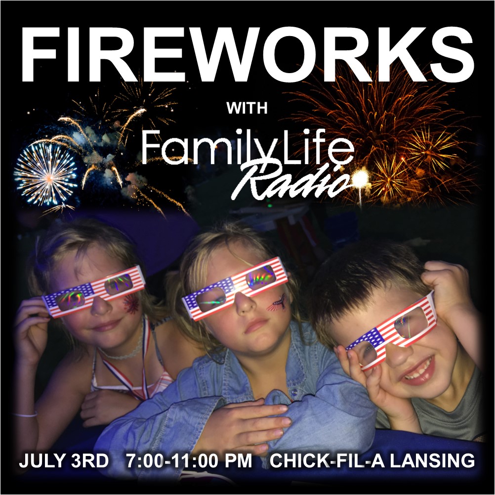 Looking for a great place to watch fireworks? Join Family Life Radio, July 3rd at Chick-Fil-A in Lansing for an incredible view of Delta Township’s professional display. We’ll have fun and games, free popsicles and free Fireworks glasses, too! Plus, Family Life Radio will be playing the perfect soundtrack for your patriotic celebration. Bring a lawn chair or blanket. Music and activities begin at 7:00 pm. Fireworks begin at dusk. Enjoy Fireworks with Family Life Radio, July 3rd at Chick-Fil-A in Lansing!