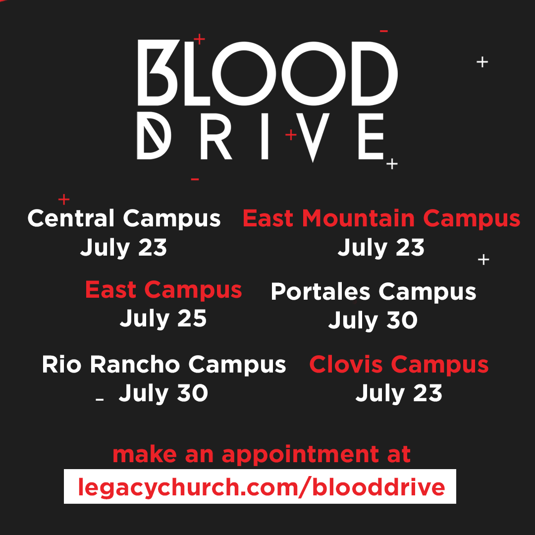 Legacy Church NM is a huge supporter of the blood donor initiative in our State. We host blood drives at all of our Albuquerque area campuses as well as those in Clovis and Portales three times a year. We believe that being a blood donor is just another way of sharing the love of Jesus and serving folks in our community.