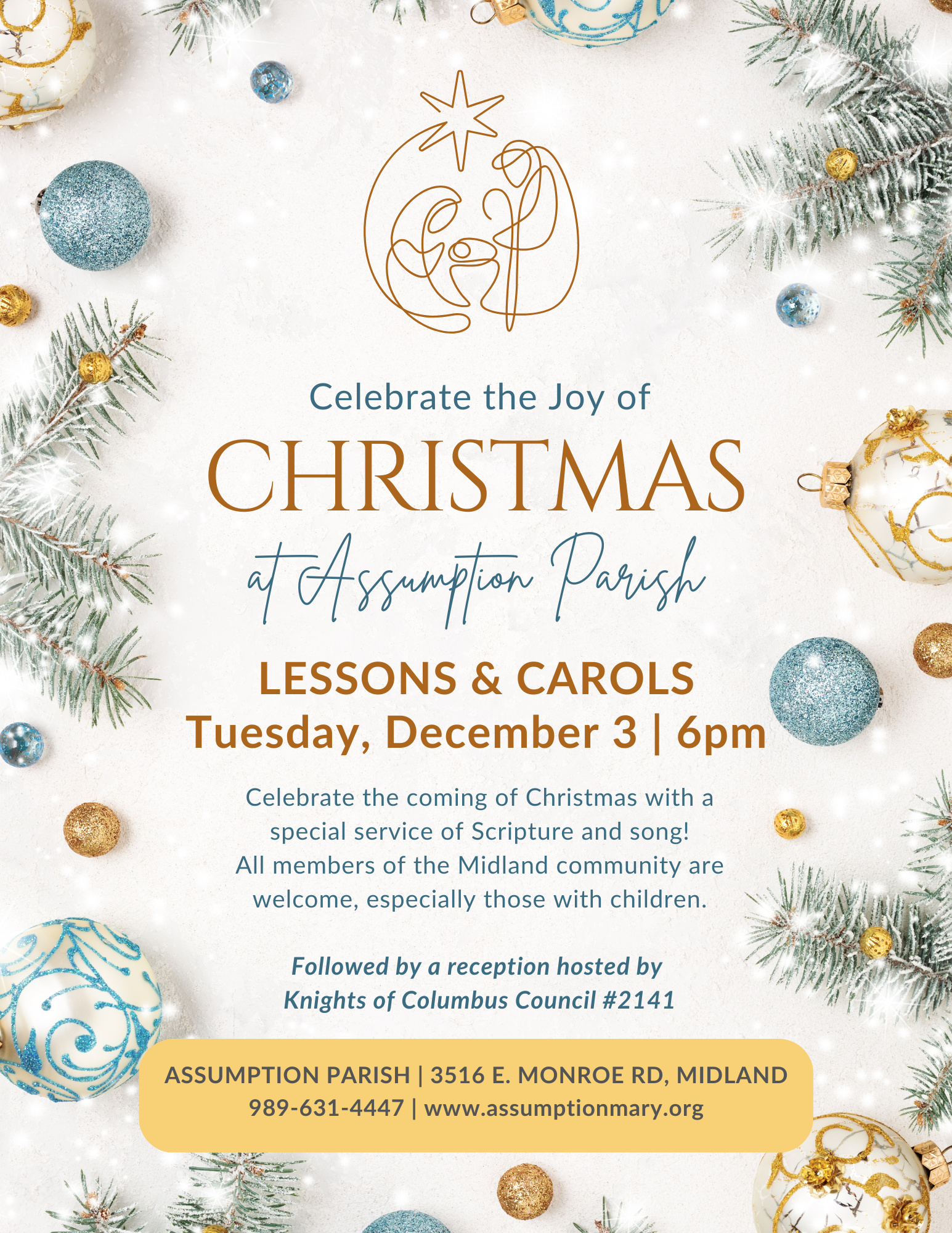 Celebrate the coming of Christmas with a special service of Scripture and song! All members of the Midland community are welcome, with a special invitation to those with children. Followed by a reception hosted by Knights of Columbus Council #2141. Held at Assumption Parish, 3516 E. Monroe Rd, Midland.