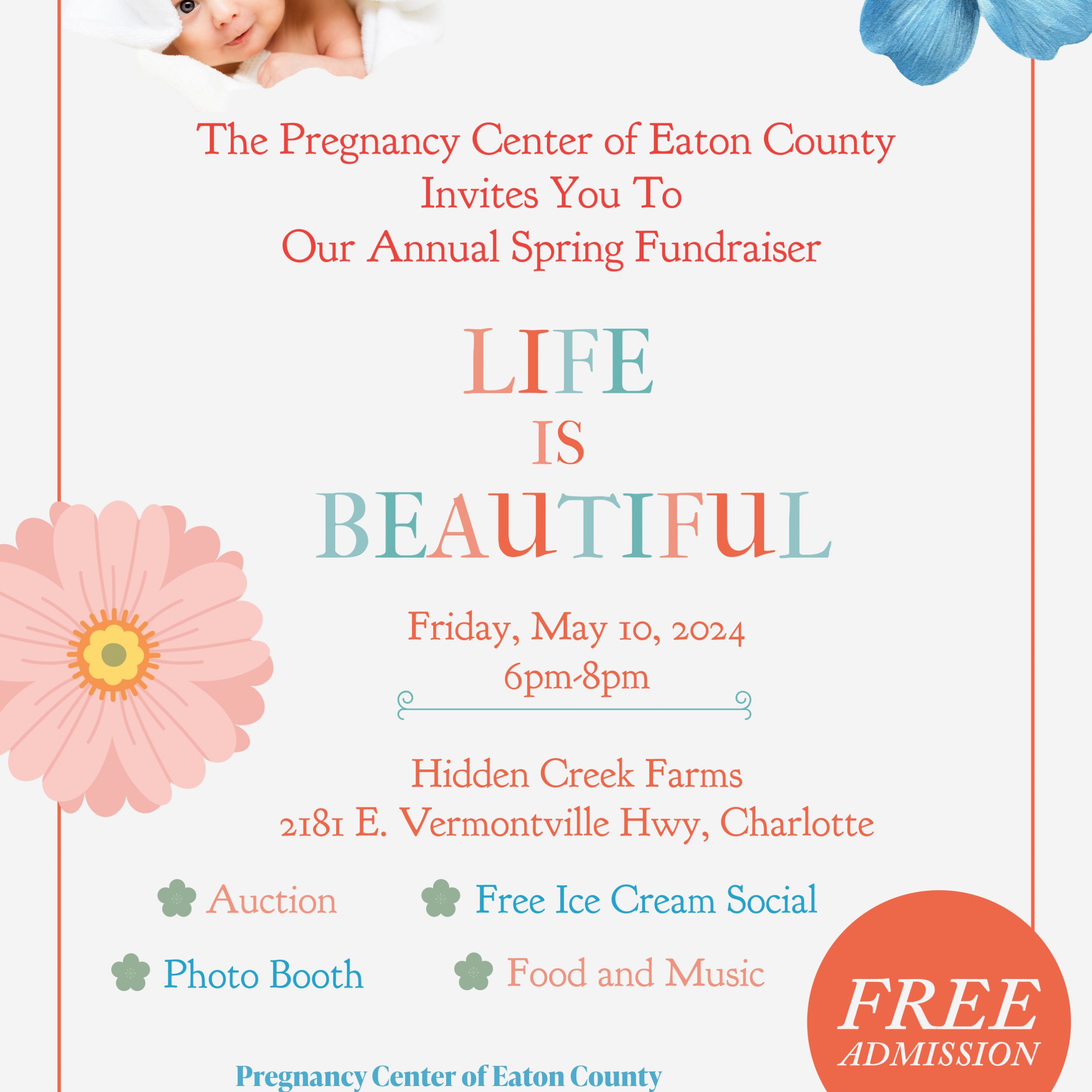 Pregnancy Center of Eaton County invites you a special LIFE IS BEAUTIFUL fundraising event! To be held at Hidden Creek Farms (2181 E Vermontville Hwy) in Charlotte – Friday May 10th, 2024 from 6 – 9 pm Free ice cream social, live music and food, silent and live auction. WE have free kid activities including face painting and a balloon artist. Also this year we are including a free photo booth! SO FUN! Support young families and have a great family night out! Call 517-543-7077 Admission is free!